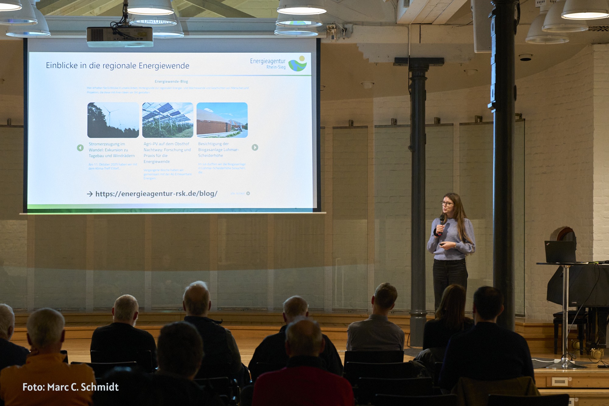 Bevor Reinhart seine Ideen vorstellte, fasste Sarah Einheuser, Klimaschutzmanagerin der Stadt Hennef, die Ergebnisse der Kommunalen Wärmeplanung nochmal für alle Teilnehmenden zusammen. Beispielsweise wurde im Zentrum Hennefs ein Wärmenetzgebiet identifiziert. Weitere mögliche Gebiete für Wärmenetze, etwa in Happerschoß und Heisterschoß, müssen als sogenannte Prüfgebiete zuerst auf Wirtschaftlichkeit geprüft werden.