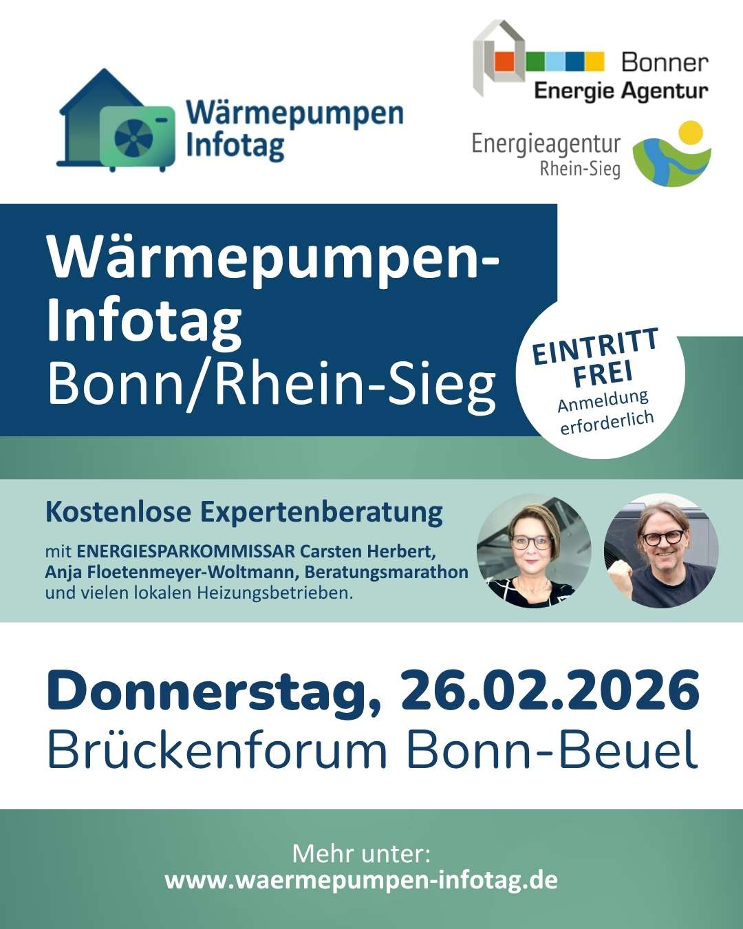 In zehn Kommunen gibt es im gesamten Bundesgebiet zwischen Oktober 2025 und März 2026 erstmals so genannte Wärmepumpen-Infotage – einer davon findet am 26. Februar 2026 für die Bürgerinnen und Bürger aus Bonn und dem Rhein-Sieg-Kreis statt. Der als Energiesparkommissar bekannte Ingenieur, Energieberater und Spiegel-Bestseller-Autor Carsten Herbert und Anja Floetenmeyer-Woltmann, Wärmepumpen-Beirätin der EU-Kommission, informieren an diesem Tag kostenlos, herstellerunabhängig und praxisnah über den Heizungstausch.